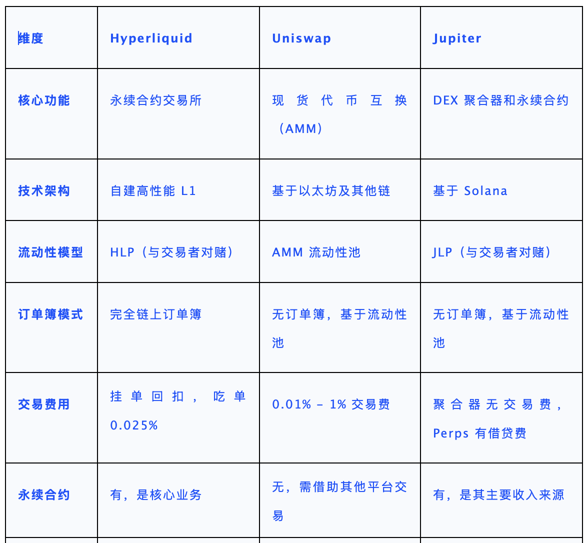 在DEX(去中心化交易所)赛道,Hyperliquid 并非唯一的玩家,它的主要竞争对手包括 Uniswap 和 Jupiter。它们各自采用了不同的技术路径和流动性模型。