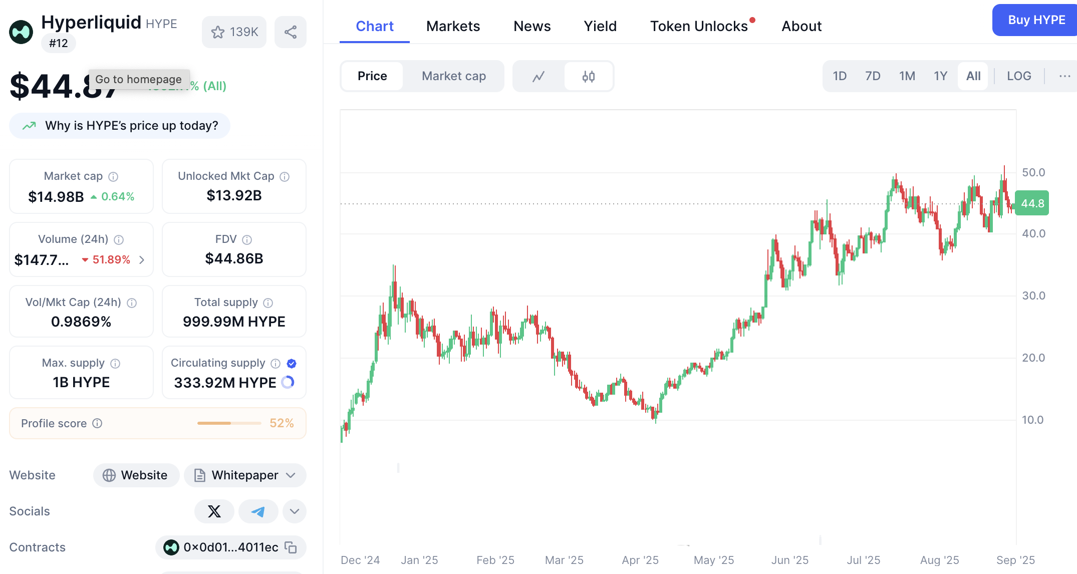 价格表现: HYPE 在 2025 年 8 月创下了 51.00 美元的历史新高(ATH) 。与一年前相比,其价格涨幅超过260%。代币在 2024 年 11 月发布,其首日收盘价为 6.25 美元,而在不到半个月内,价格就暴涨了五倍多,达到 35 美元的峰值。