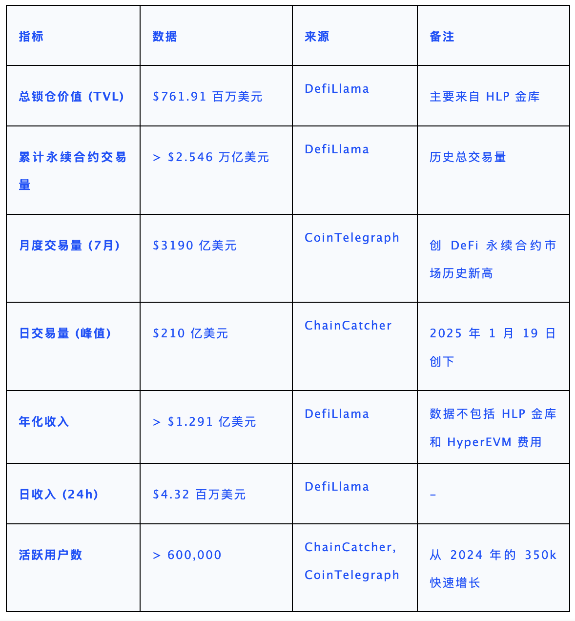 下表提供了 Hyperliquid 关键数据的一个宏观视图,能够直观感受其在加密市场的体量和影响力。
