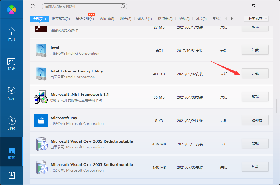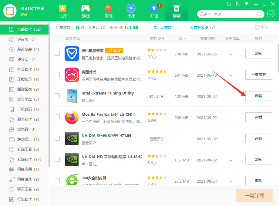 方法三:安装并打开360软件管家,在卸载选项的列表中找到英特尔极限超频工具软件,点击卸载即可